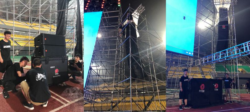 由于表演区域扩声扬声器组间距太宽,因此在大屏正中还布置了两组拉声相扬声器作为表演区的补充,能够更好的提高场地直达声和清晰度。并且通过调整均衡、延时、增益和相位,使表演区补声扬声器具有和主扩扬声器类似的声音特性,整体声场度非常好。